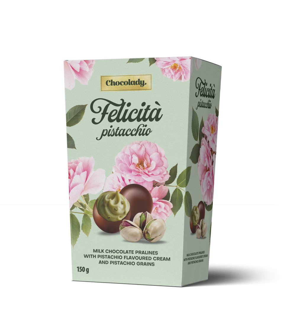 Tejcsokoládé (50%) (cukor, kakaóvaj, teljes tejpor, kakaómassza, emulgeálószer (szójalecitin), természetes vanília aroma), Pisztácia ízű krémtöltelék (44%) (cukor, növényi zsír (kókusz és napraforgó változó arányban), sovány tejpor, tejsavópor, kakaóvaj, emulgeálószer (szójalecitin), aromák (pisztáciát tartalmaz)), Pisztácia darabok (6%). Tartalmazhat mandulát, törökmogyorót, földimogyorót, búzát, árpát és tojást. Kakaó szárazanyag a tejcsokoládéban legalább 30%. Száraz, hűvös, szagtalan helyen tárolandó. Minőségét megőrzi (nap, hónap, év): a csomagoláson jelzett időpontig. Forgalmazza: SZ&L Kereskedőház Kft. 2085 Pilisvörösvár Sas utca 4.