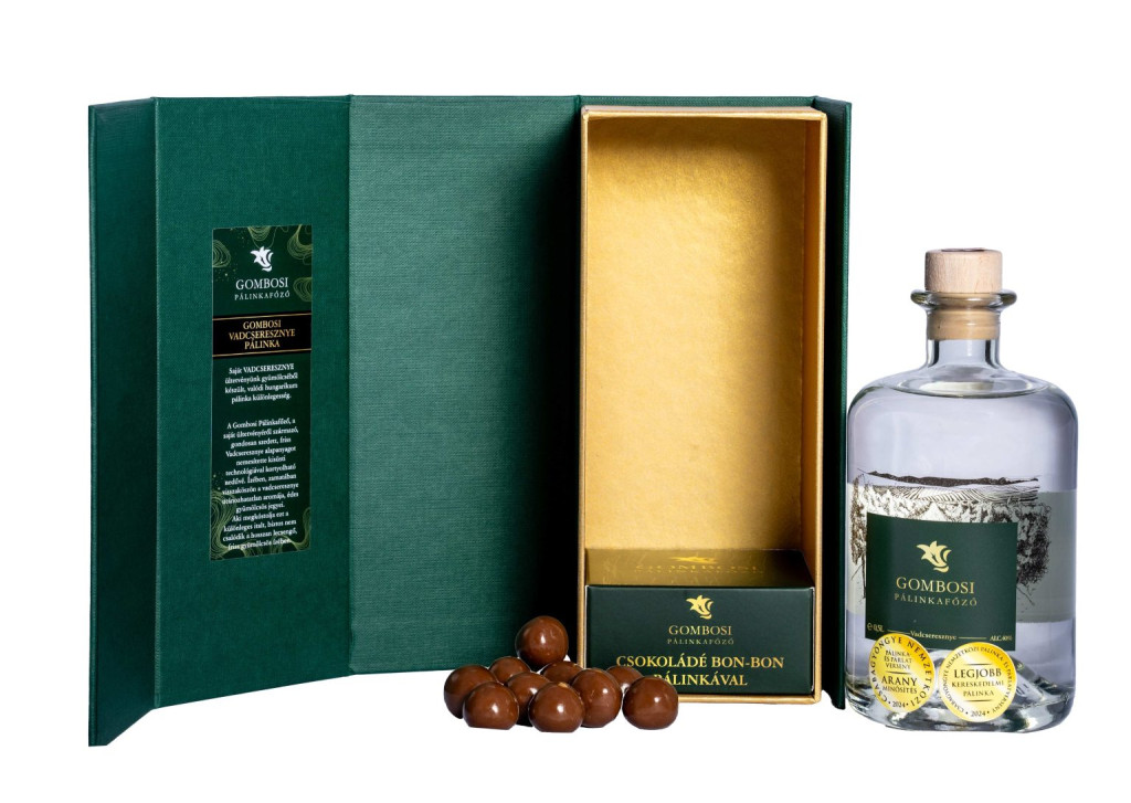 A Gombosi Pálinkafőző saját Vadcseresznye ültetvényéről származó gyümölcsből készült, limitált és díjnyertes pálinka különlegesség. A Vadcseresznye utánozhatatlan zamata és aromája egy kis mandulás ízzel párosul, ami felejthetetlen élményt biztosít a pálinka kedvelőknek. Díszdobozban kapható, ajándék pálinkával töltött csokoládé bon-bonnal (80g).