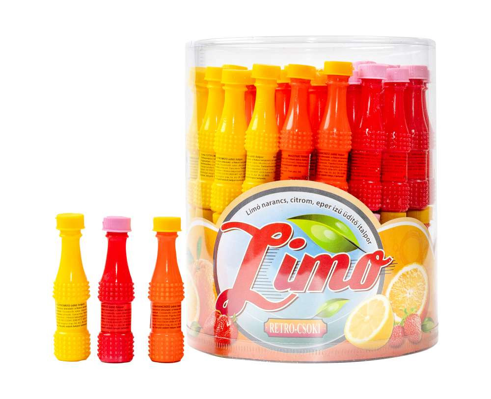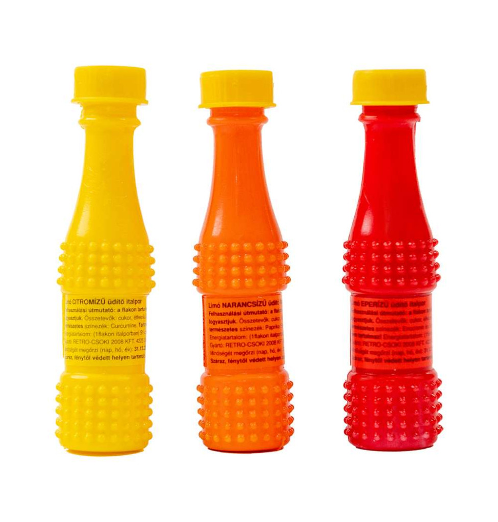 Cukor, étkezési sav (citromsav), természetes citrom, narancs és eper aroma, paprika kivonat, természetes színezék (kurkumin, enocianin, strawberry red). Minőségét megőrzi (nap, hónap, év): a csomagoláson jelzett időpontig. Száraz, hűvös helyen tárolandó. Forgalmazza: Retro-Csoki 2008 Kft, 4225 Debrecen, Elek utca 164.