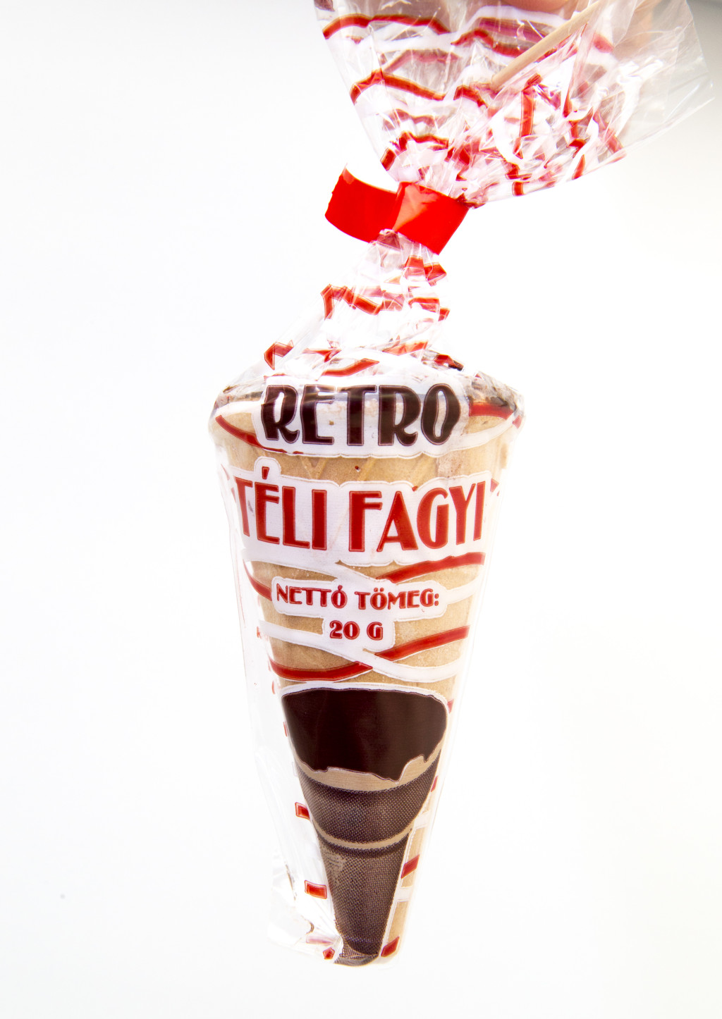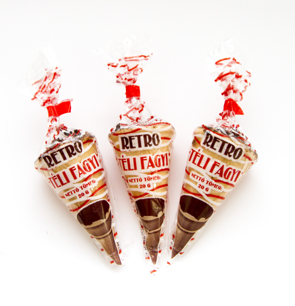 Margarin (növényi zsírok (pálma), növényi olaj (repce), víz, zsírsavak mono-és digliceridjei, napraforgó lecitin, étkezési só (0,25%), tartósítószer (szorbinsav), vajaroma, savanyúságot szabályozó anyag (citromsav), színezék (béta-karotin), cukorliszt (porcukor és 4% kukoricakeményítő)), kakaós étbevonó (cukor, teljes mértékben hidrogénezett növényi zsír (pálmamag), zsírszegény kakaópor (9%), emulgeálószer (lecitinek, E476), aroma), ostyatölcsér (víz, búzaliszt, pálmazsír, burgonyakeményítő, szójalecitin, térfogatnövelőszer (nátrium-hidrogénkarbonát), só, édesítőszer (nátrium-szaharinát, kakaópor, pálmazsír). Tartalmazhat tejszármazékot. Minőségét megőrzi (nap, hónap, év): a csomagoláson jelzett időpontig. Száraz, hűvös helyen tárolandó. Forgalmazza: Retro-Csoki 2008 Kft, 4225 Debrecen, Elek utca 164.
