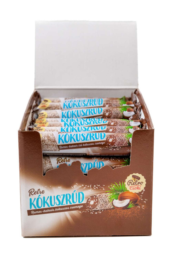 Kekszőrlemény (búzaliszt, cukor, pálmazsír, térfogatnövelőszer (nátrium-hidrogénkarbonát, ammónium-hidrogénkarbonát), étkezési só, aroma, színezék (karamell), antioxidánsok (borkősav (L(+)-), kálium-metabiuszulfit)), glükóz-fruktóz szörp, fondan (cukor, ivóvíz, glükózszirup, savanyúságot szabályozó anyag (citromsav)), növényi zsír (pálma), víz, kókuszreszelék (4,3%), nedvesítőszer (szorbit szirup), zsírszegény kakaópor (0,7%), margarin (növényi zsírok (pálma, kókusz), víz, emulgeálószerek (E475, E471, lecitin), só (0,2%), étkezési sav (ciromsav), aroma, színezék (karotinok)), sovány tejpor, glükózszirup, aromák (rum, kókusz, vanília). Tartalmazhat szóját és dióféléket. Minőségét megőrzi (nap, hónap, év): a csomagoláson jelzett időpontig. Száraz, hűvös helyen tárolandó. Forgalmazza: Retro-Csoki 2008 Kft, 4225 Debrecen, Elek utca 164.