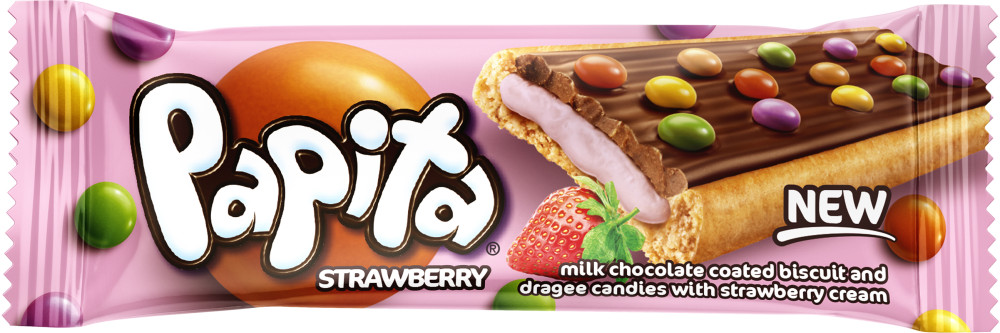 Keksz (35%) [búzaliszt (glutén), növényi olaj (pálma), cukor, fruktóz szirup (kukorica), térfogatnövelő szer (ammónium-hidrogénkarbonát, nátrium-pirofoszfát, nátrium-hidrogénkarbonát), teljes tejpor, só, emulgeálószer (napraforgó lecitin)], Tejcsokoládé (33%) [cukor, kakaóvaj, savópor (tejszármazék), teljes tejpor, kakaómassza, emulgeálószer (ammónium-foszfatid), aroma], Epres krém (22%) [cukor, növényi olaj (pálma), savópor (tejszármazék), teljes tejpor, eperpor (1%), savanyúságot szabályozó anyag (citromsav), emulgeálószer (napraforgó lecitin), színezék (céklavörös) aroma], Cukordrazsé (10%) [cukor, növényi olaj (pálma), rizskeményítő, kakaópor, sűrítőanyag (gumiarábikum), kukoricakeményítő, színezék (béta-karotin, céklavörös, karamell, klorofillek és klorofillinek rézkomplexei, kurkuma), emulgeálószer (napraforgólecitin), fényezőanyag (karnaubaviasz), aroma. Kakaó szárazanyag tartalom a tejcsokoládéban minimum 30%. Tej szárazanyag tartalom a tejcsokoládéban minimum 14%. A termék tartalmazhat földimogyorót, egyéb dióféléket, szóját, szezámmagot és tojást.